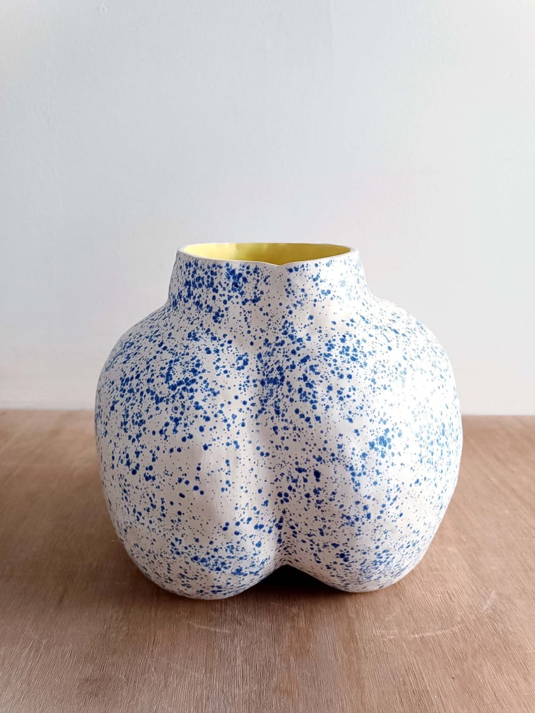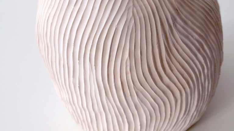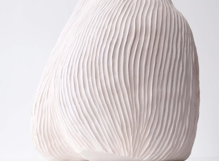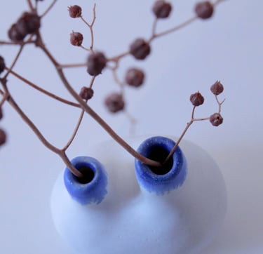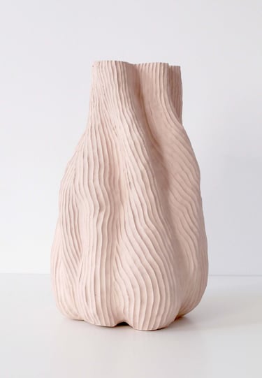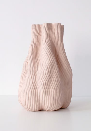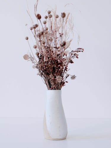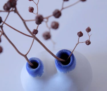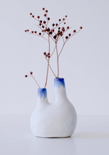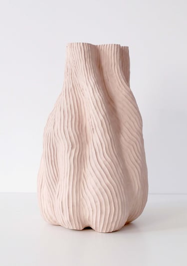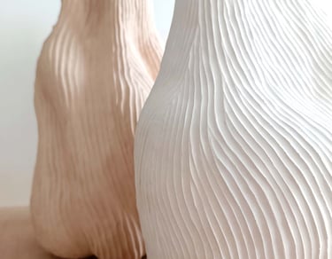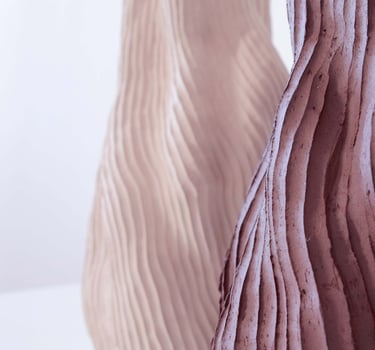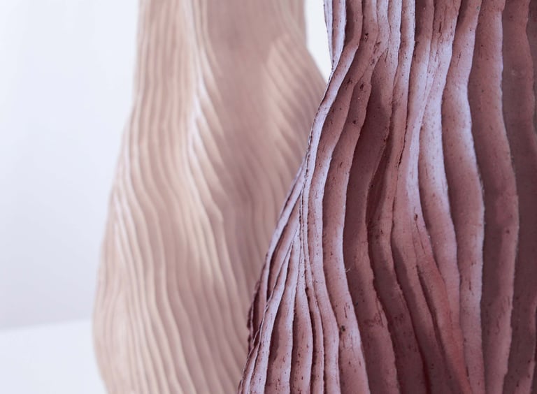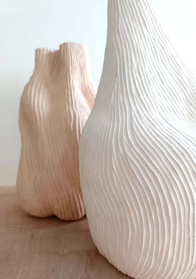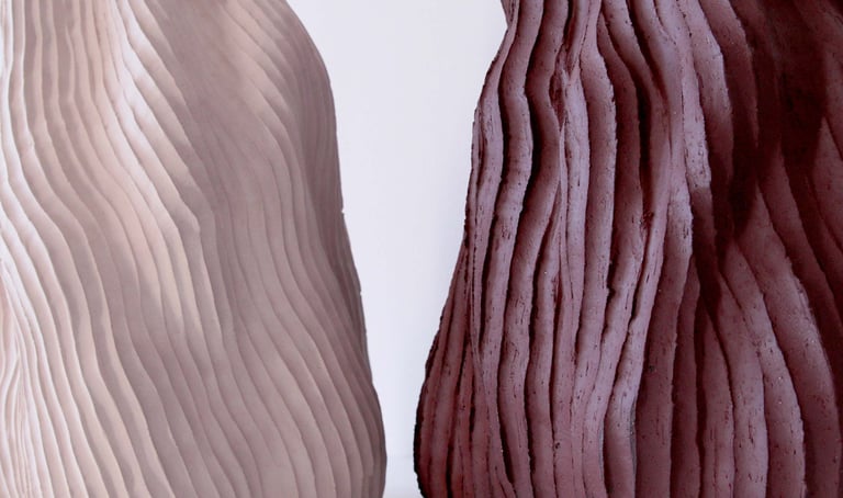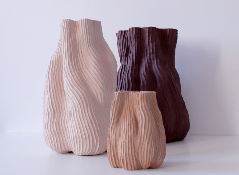 Vases aux dimensions variables, mêlant terre brute et émaux mats.